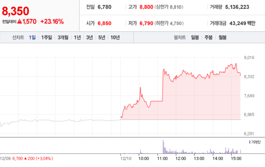 뉴프렉스 ( 085670 : 코스닥 ) + 15.54 % - 12월 10일 장 마감 기준
