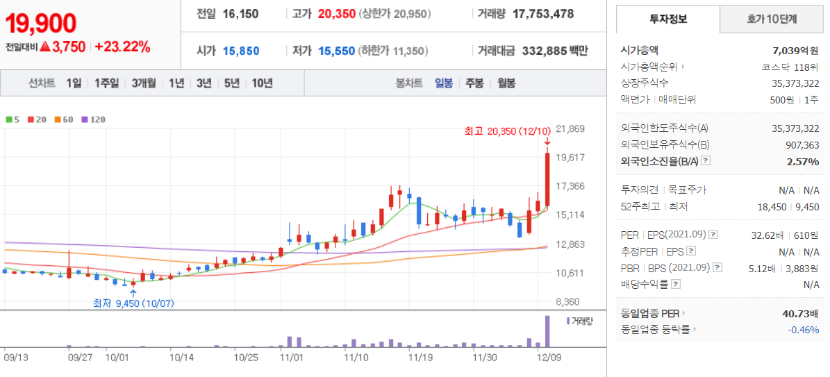 넥슨지티 (041140 : 코스닥 ) + 23.22 % - 12월 10일 장 마감 기준