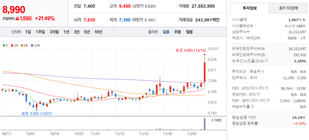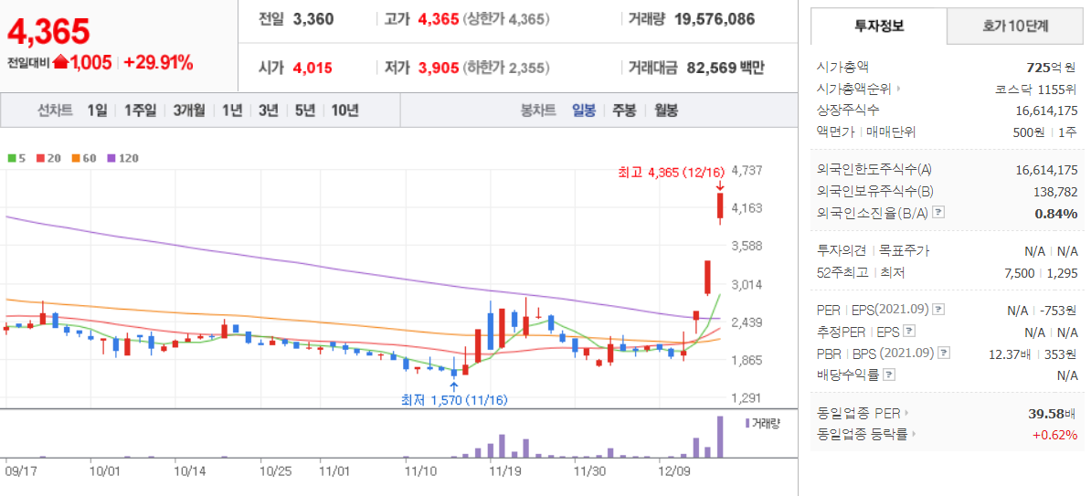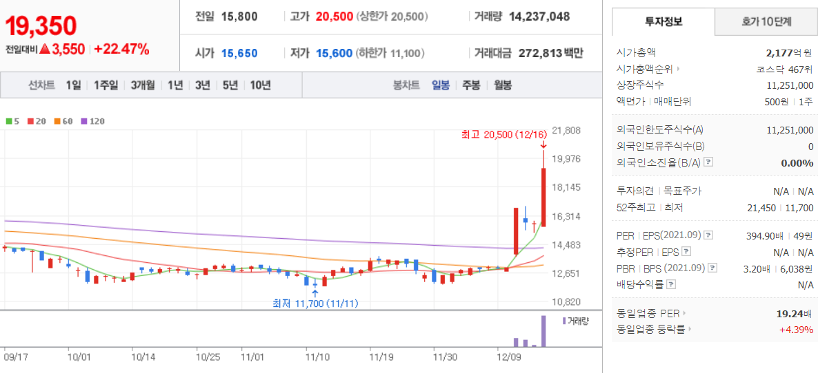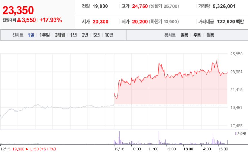 픽셀플러스 ( 087600 : 코스닥 ) + 23.13 % - 12월 16일 장 마감 기준