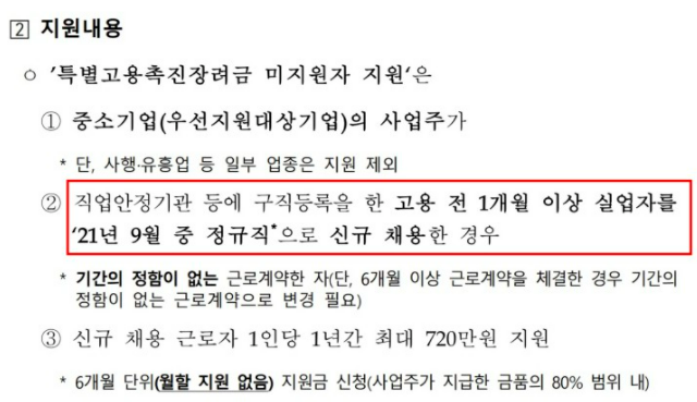 ’21년 9월 신규 채용한 사업주 중 사전 신청자에 한해 한시적으로 지원금 신청 자격 부여