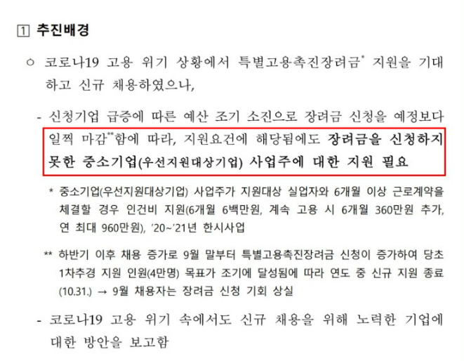 - 신청기업 급증에 따른 예산 조기 소진으로 장려금 신청을 예정보다 일찍 마감함에 따라, 지원요건에 해당됨에도 장려금을 신청하지 못한 중소기업(우선지원대상기업)사업주에 대한 지원 필요함.
